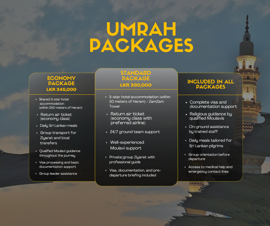 Travel with experienced Moulavis, enjoy Sri Lankan meals, and rely on our 24/7 support team. We ensure your pilgrimage is smooth, respectful, and well-guided.
